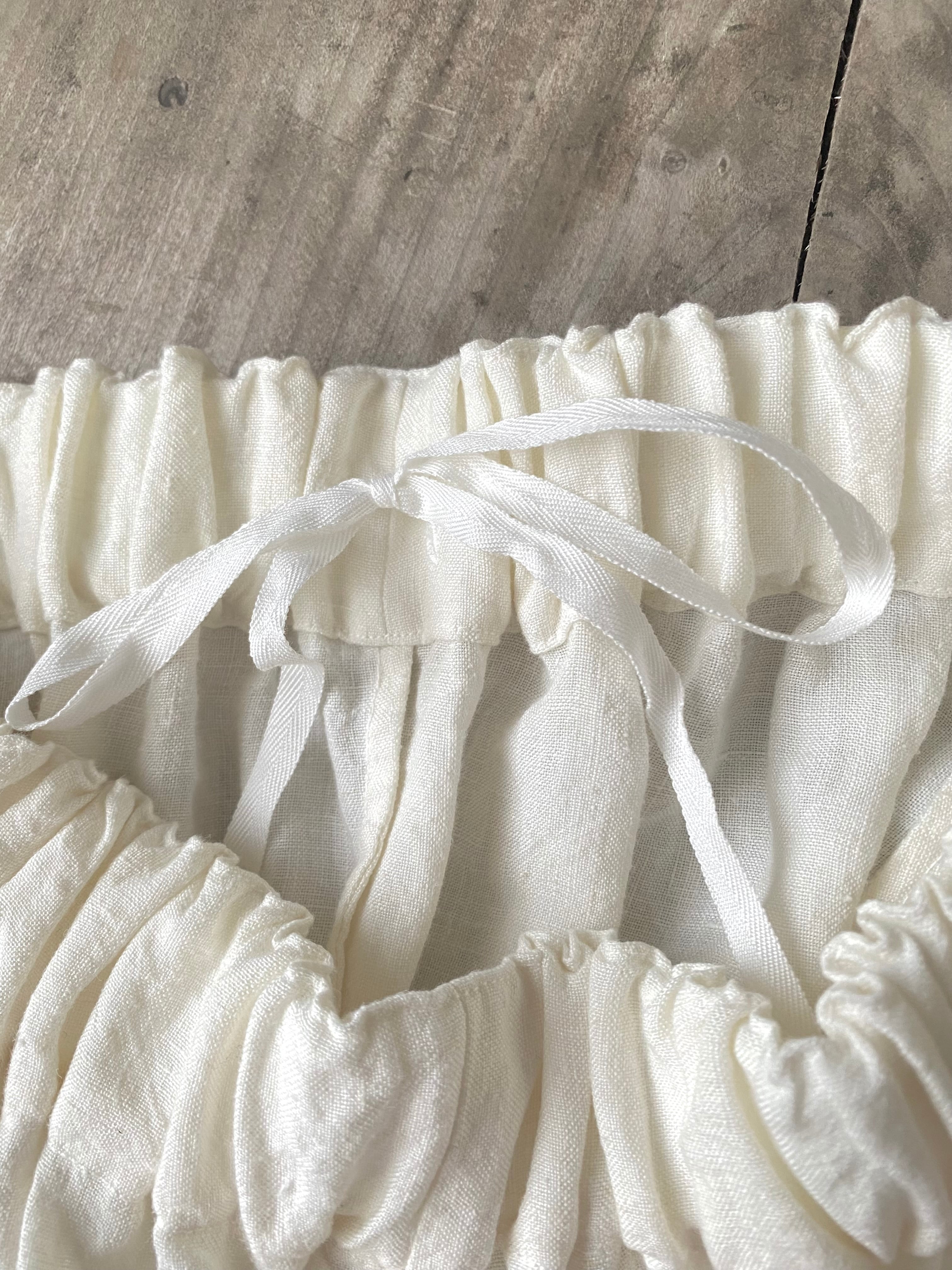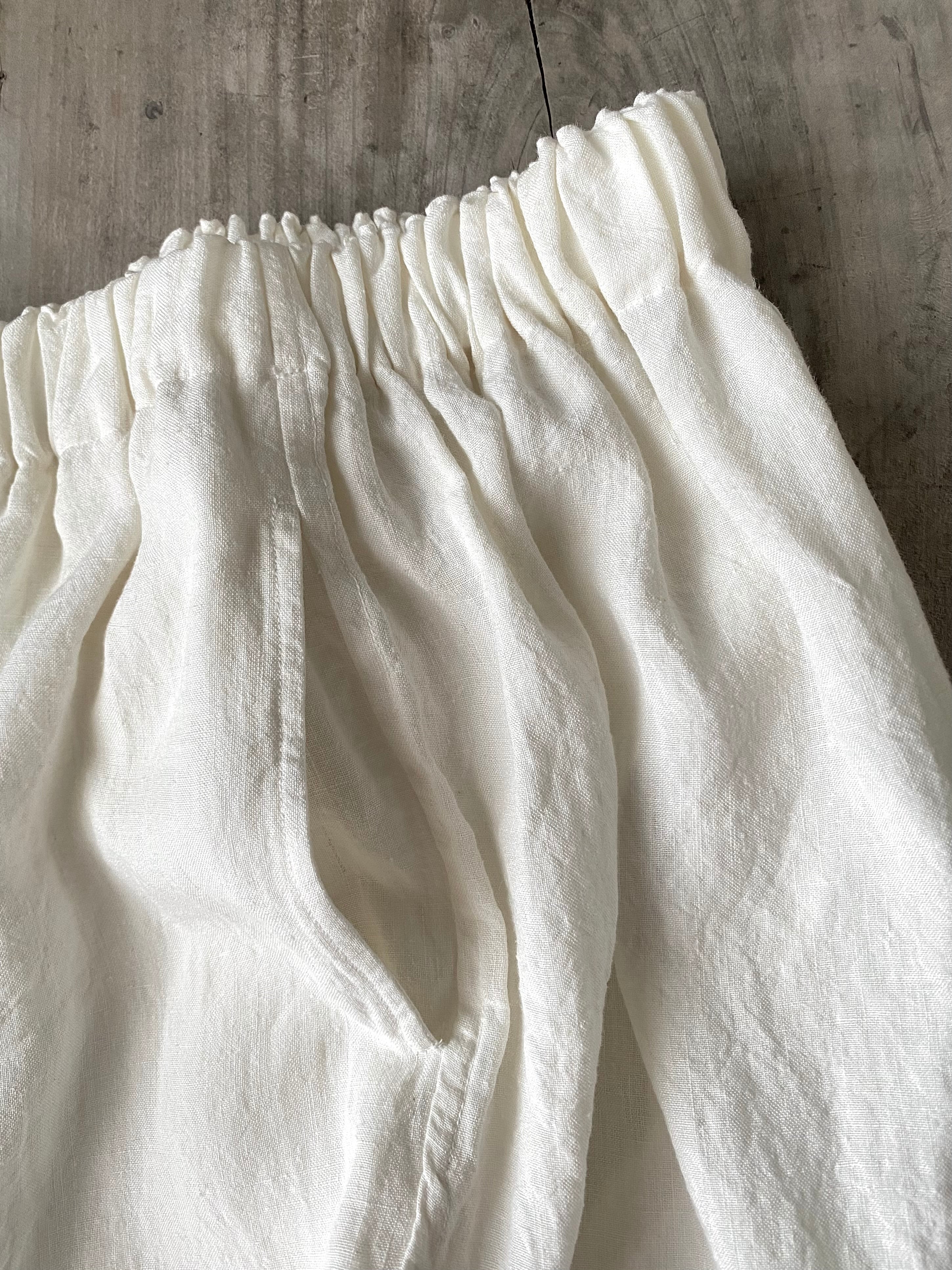 脇ポケット付き。ウエストはゴム仕様、リボンで調整可能。